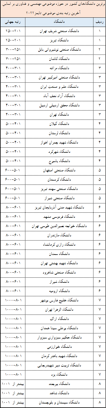 برترین دانشگاه های مهندسی و فناوری ایران بر اساس آخرین رتبه‌بندی (جهانی) موضوعی تایمز- 2022