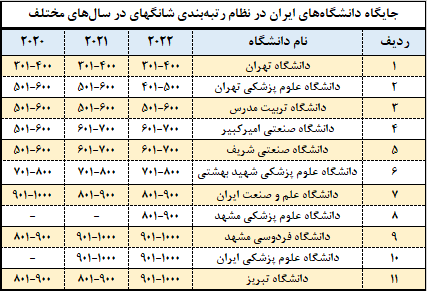 1000 دانشگاه در آخرین رتبه‌بندی شانگهای -که امسال هجدهمین سالی است که دانشگاه شانگهای ژیائوتنگ نتایج آن را منتشر می‌کند- حضور داشته‌اند. 12 دانشگاه از کشور در آخرین رتبه‌بندی شانگهای حضور داشته‌اند. در این میان یکی از نکات جالب توجه ارتقای جایگاه دانشگاه‌های شیراز و تبریز و نیز راه‌یافتن دانشگاه گیلان به این رتبه بندی است. 12 دانشگاه برتر کشور بر اساس رتبه‌بندی شانگهای- 2020 از قرار زیر هستند: